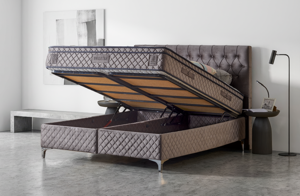 Postelja z dvižnim dnom nudi dodaten prostor za shranjevanje. Stabilnost postelje omogoča trdnost same baze, ki preprečuje premikanje. Vzmetnica telesu nudi odlično podporo, kvalitetna prešita tkanina pa omogoča večjo zračnost in odvajanje vlage. Vzmetnica ima obojestransko uporabo.