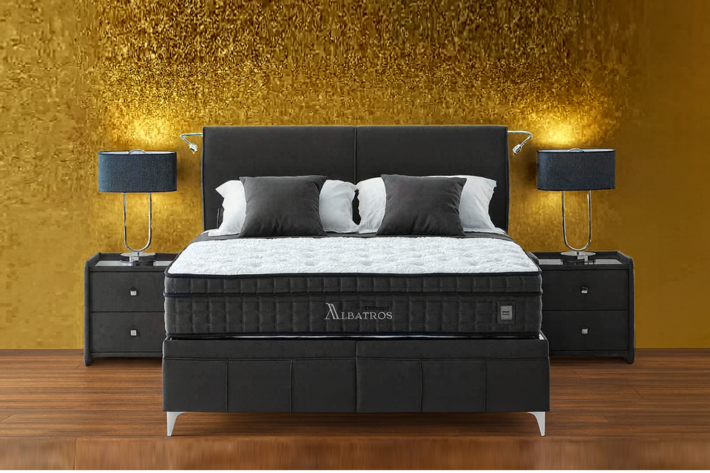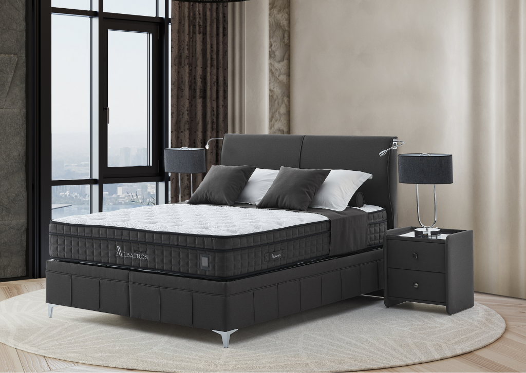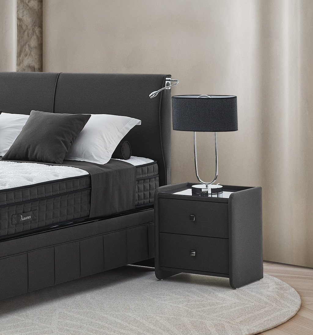 Izrazit, kvaliteten in dominanten posteljni okvir ALBATROS z dvižnim dnom in predalom, izdelan za hotelske potrebe svetovnih hotelskih verig visokih kategorij , zagotavlja zanesljivost in trdnost ter navdušuje s svojim dizajnom. Bogato in elegantno vzglavje ter nenavadna konstrukcija sta njeni glavni značilnosti. Višina vzglavja: 121 cm, širina 202 cm + lučke cca 2 x 10 cm, skupaj cca 222 cm . Lučki za branje katere se po želji fixirajo na vzglavje, vključeni v ceno kompleta. Vzglavje in dno postelje je dobavljivo v 2 delih, zaradi lažjega vnosa v vaš prostor. Višina posteljnega dna je 38 cm.( nogice 12 cm+ box 26 cm skupaj 38 cm). Dvižno dno je kovinsko, ima trdno ravno površino, oblečeno v črno nedrsečo podlago / tkanino na katero se postavi vzmetnica. Dvižni plinski mehanizem ima dodatna varovala proti nenadnem zaprtju, ko je dno postelje dvignjeno. Postelja z dvižnim dnom nudi dodaten prostor za shranjevanje. Stabilnost postelje omogoča trdnost same baze, ki preprečuje premikanje. Postelja in nočne omarice imajo višino nogic na sliki 12 cm. V kolikor žeite pa je to možno spremeniti na višino 4 cm oz. 7,5 cm oz.10 cm oz 12 cm.