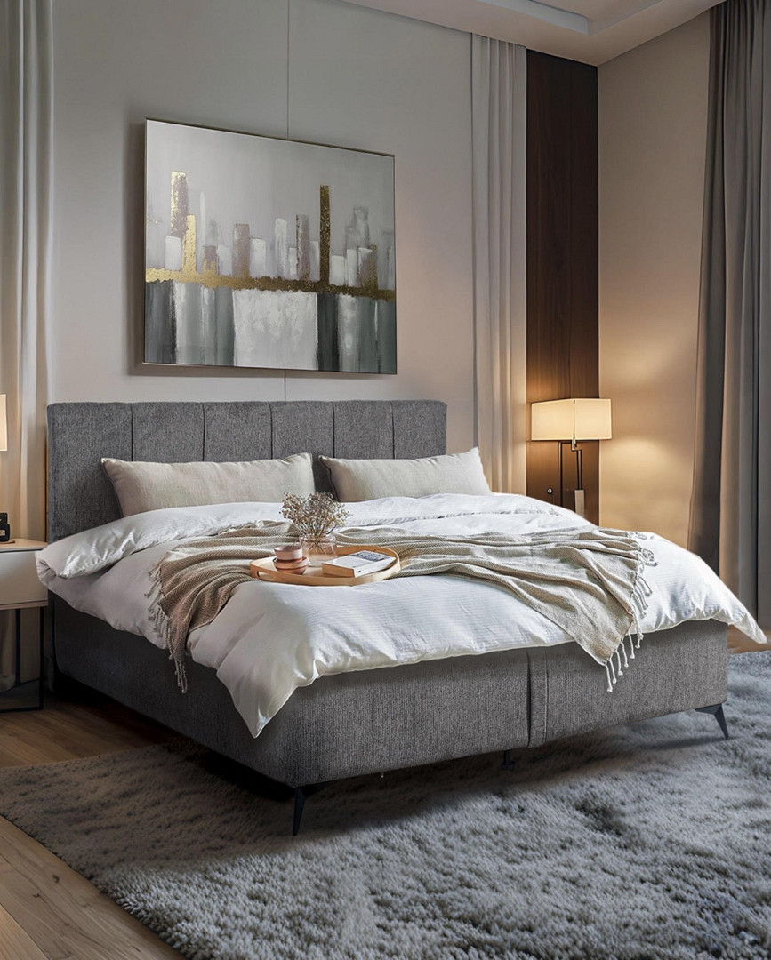 Boxspring postelja Cardiff, vključuje izrazit, kvaliteten in dominanten, močen posteljni okvir z dnom , zagotavlja zanesljivost in trdnost ter preprosto navdušuje s svojim dizajnom. Bogato in elegantno vzglavje ter nenavadna konstrukcija so njene glavne značilnosti. Višinama vzglavja je 118 cm. Višina posteljnega dna na katerega postavite vzmetnico je 32 cm. Dno postelje je ravno in je vpeto v konstrukcijo postelje, kar omogoča dodatno trdnost / stabilnost postelje. Rob postelje je rahlo dvignjen, kar omogoča stabilnost vzmetnice, ki preprečuje premikanje le-te. Barva postelje je bež, tkanina, odličen na dotik in enostaven za vzdrževanje. Skupna višina spalne površine je cca 53/54 cm