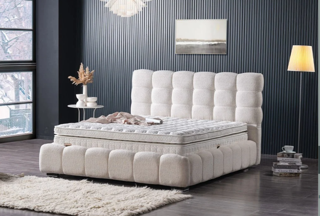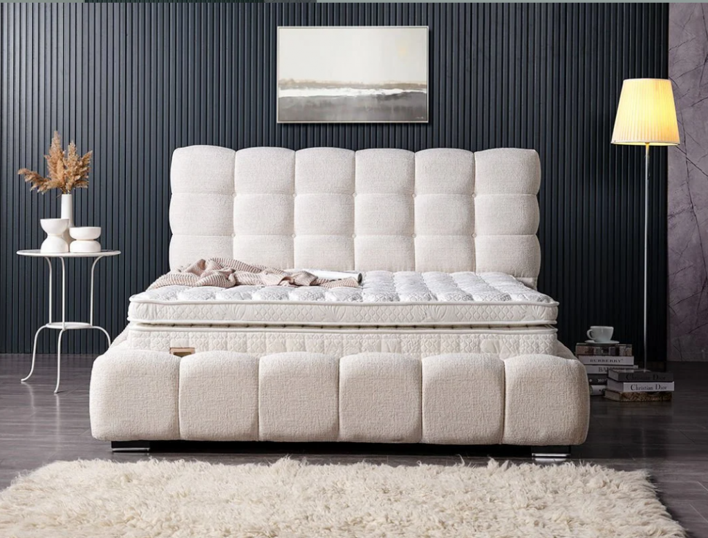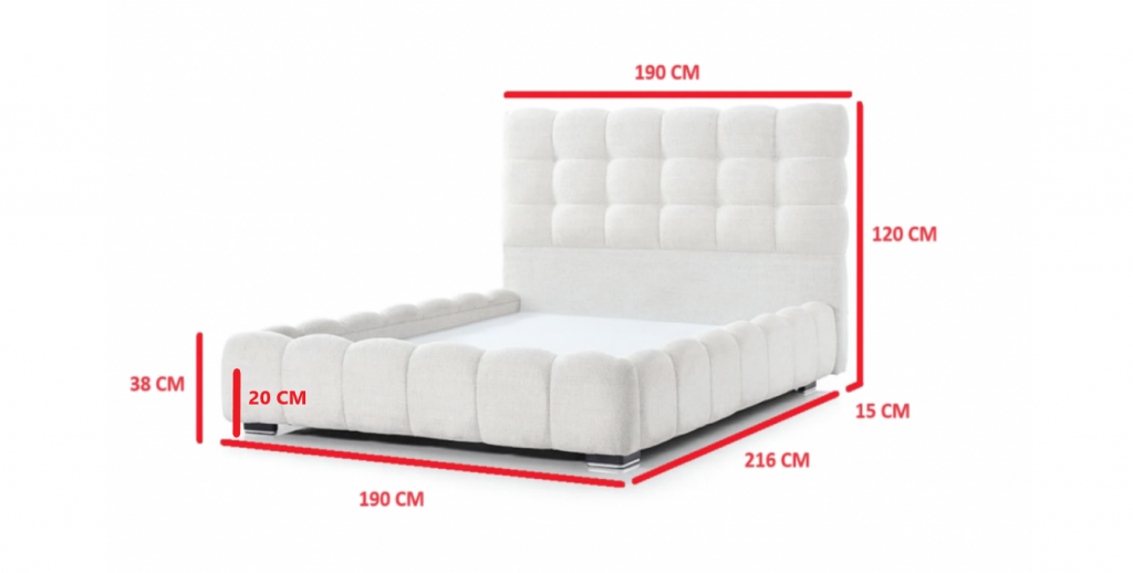 Boxspring postelja POUF 02, vključuje izrazit, kvaliteten in dominanten, močen posteljni okvir z dnom , zagotavlja zanesljivost in trdnost ter preprosto navdušuje s svojim dizajnom. Bogato in elegantno vzglavje ter nenavadna konstrukcija so njene glavne značilnosti. Višinama vzglavja je 120 cm. Višina posteljnega dna na katerega postavite vzmetnico je cca 20 cm. Dno postelje samostojno ravno z nastavljivimi nogicami v primeru neravnih tal na katerega se postavi vzmetnica. Rob postelje je rahlo dvignjen, kar omogoča stabilnost vzmetnice, ki preprečuje premikanje le-te. Barva postelje je bež, tkanina, odličen na dotik in enostaven za vzdrževanje. Skupna višina spalne površine je cca 50 cm