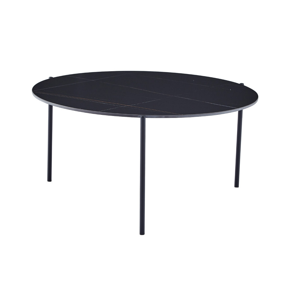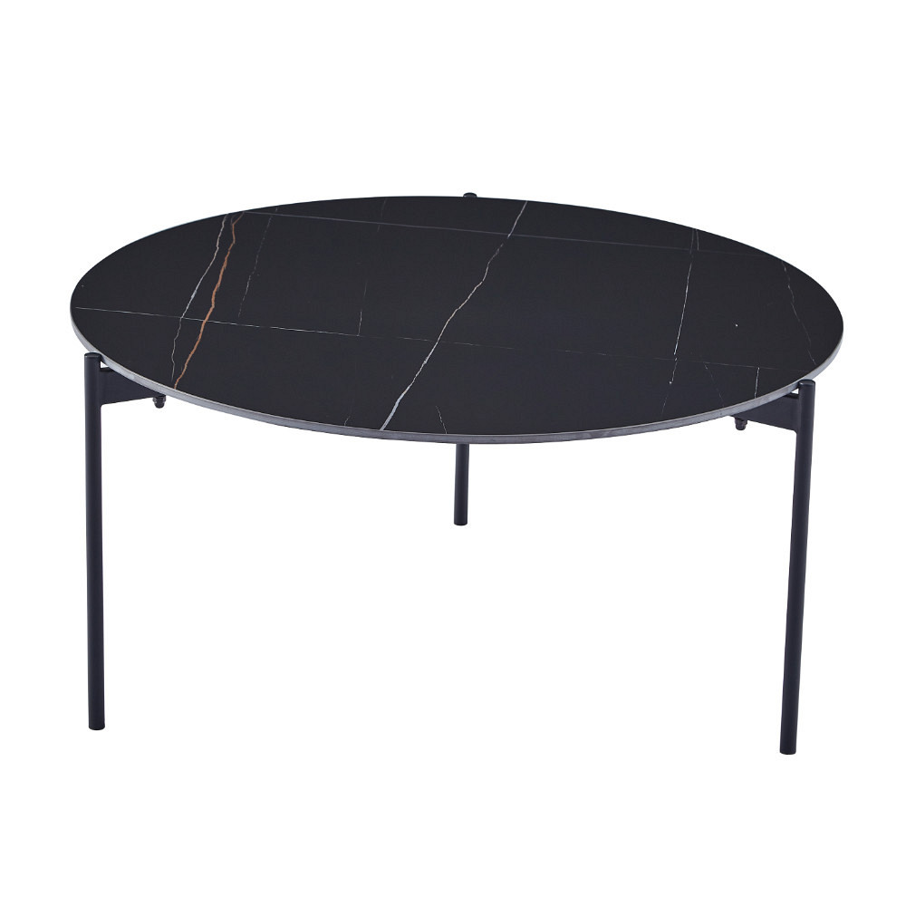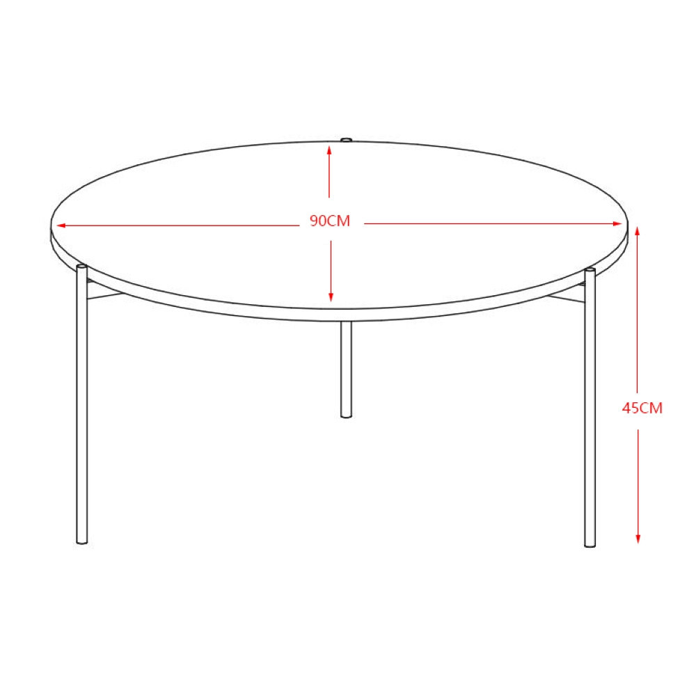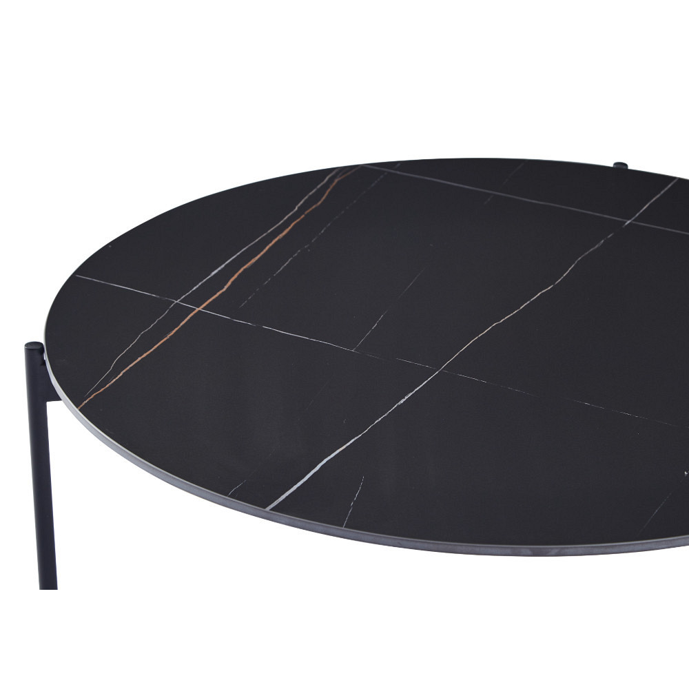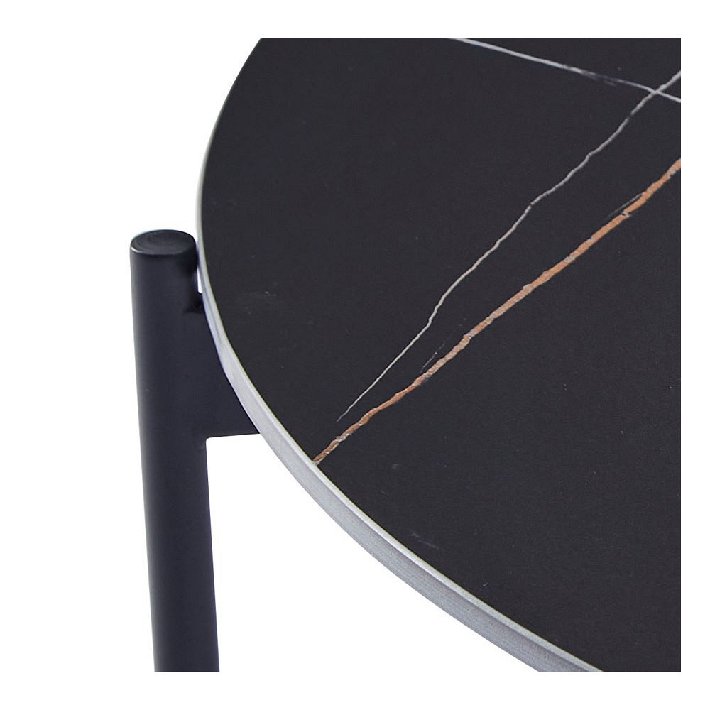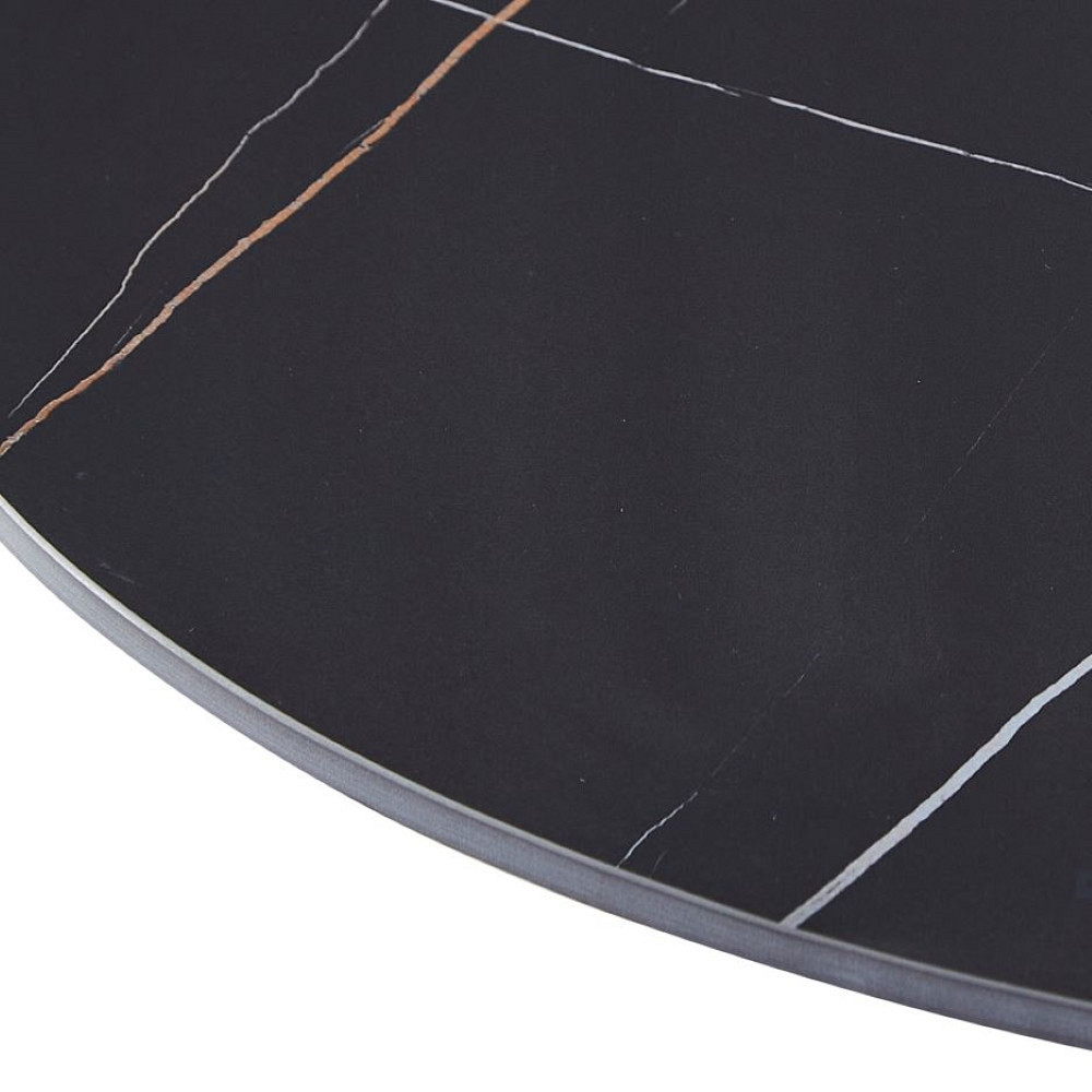 udovita klubska miza okrogle oblike, ki se bo lepo podala v vašo dnevno sobo. Na voljo je v črni barvi z zlatimi linijami. Namizna plošča ima premer 90 cm, je na višini 45 cm od tal in je debela 1,2 cm. Narejena je iz sintranega kamna z vzorcem črnega marmorja z zlatimi žilami. Sintrani kamen je narejen iz kombinacije naravnega kamna v različnih barvah in ima več prednosti pred navadno keramiko. Je močnejši od velikih keramičnih plošč in se ne razbije zlahka. V primerjavi s ploščami iz naravnega granita pa je tudi naravno vodoodporen. Prav tako je okolju prijaznejši od kemično obdelanih kremenčevih plošč. Noge in okvir mize so narejeni iz kovinskih cevi, prašno lakiranih v črno barvo za boljšo zaščito. Maksimalna nosilnost mize je 120 kg..V primeru, da želite izdelek v drugi barvi, oz.za vas željene količine izdelka trenutno ni na zalogi, se za vse informacije obrnite na nas preko e maila ali telefona.