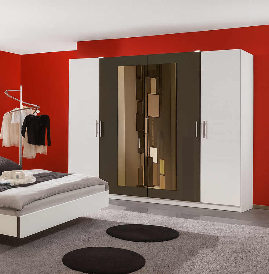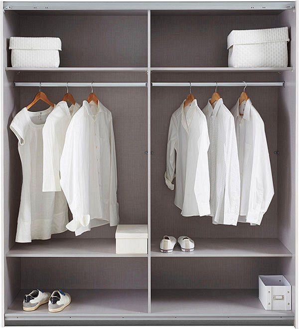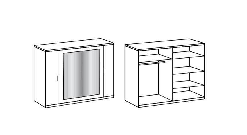 Notranjost omare vsebuje v ceni kompleta :1 polica + obešalna palica po celotni širini omare ter dodatni 2 nastavljivi polici po višini. Možnost dokupa pregrad za omaro, polic, predalov, luči, mehkega zapiranja. Na voljo tudi različni predalniki in ogledalo. Za vse dodatne informacije se obrnite na nas preko e maila ali telefona.