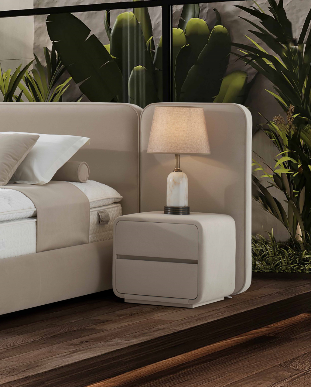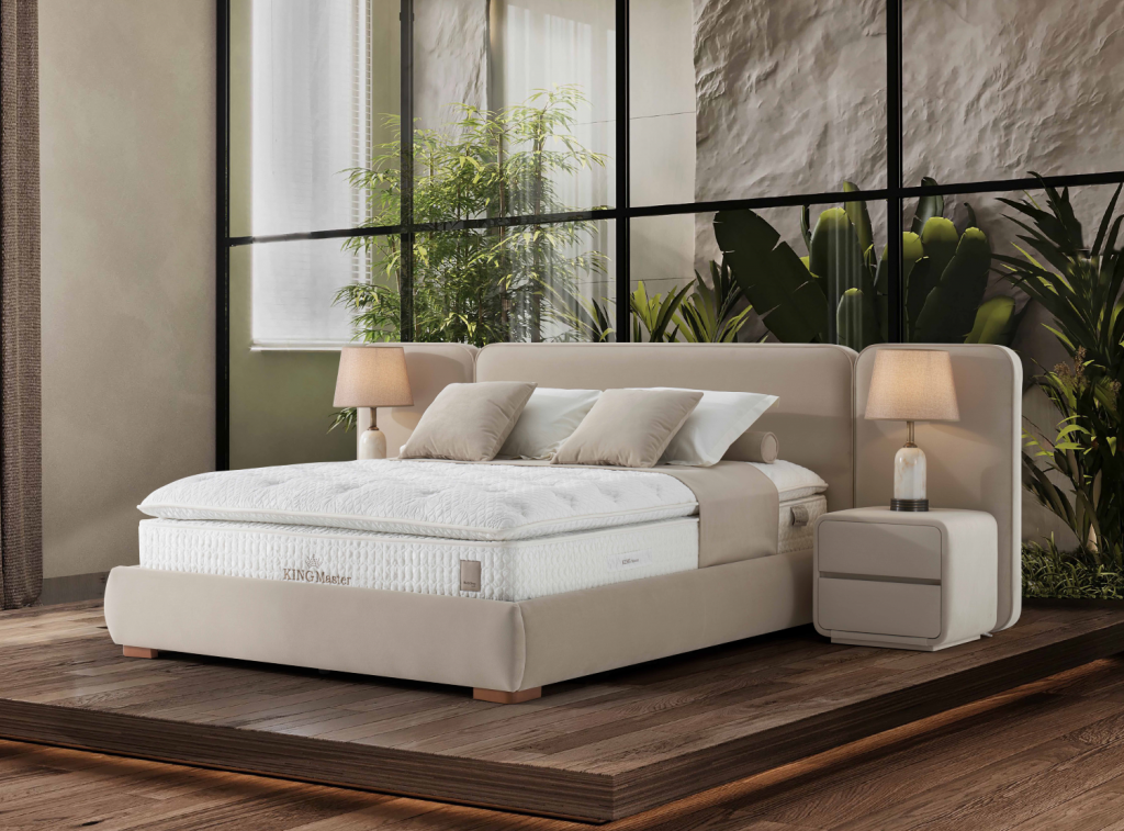 izrazit, kvaliteten in dominanten posteljni okvir KINGMASTER z dvižnim dnom in predalom, izdelan za hotelske potrebe svetovnih hotelskih verig visokih kategorij, zagotavlja zanesljivost in trdnost ter navdušuje s svojim dizajnom. Bogato in elegantno vzglavje ter nenavadna konstrukcija sta njeni glavni značilnosti. Višina vzglavja: 101 cm širina 300 cm .Vzglavje je dobavljivo v 3 delih ,dno postelje je dobavljivo v 2 delih, zaradi lažjega vnosa v vaš prostor; Višina posteljnega dna je 30 cm.( nogice 4 cm + box 26 cm skupaj 30 cm). Dvižno dno je kovinsko, ima trdno ravno površino, oblečeno v črno nedrsečo podlago / tkanino na katero se postavi vzmetnica. Dvižni plinski mehanizem ima dodatna varovala proti nenadnem zaprtju, ko je dno postelje dvignjeno. Postelja z dvižnim dnom nudi dodaten prostor za shranjevanje. Stabilnost postelje omogoča trdnost same baze, ki preprečuje premikanje. Postelja ima višino nogic na sliki 4 cm. V kolikor žeite pa je to možno spremeniti na 4 cm oz 7,5 cm oz.10 cm oz 12 cm. Nočni omarici sta vključene v ceno izdelka, dimenzije: š:50 x v 45 cm x g 41 cm. Nočna omarica ima 2 predala na kovinskih vodilih. Možen je tudi napuk postelje brez nočnih omaric.