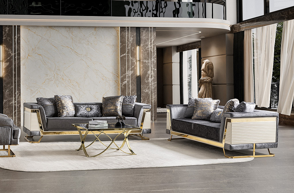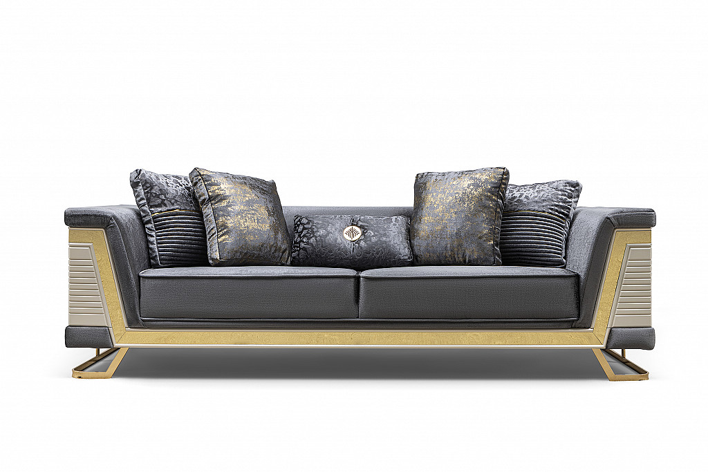 Sed grt RIXOS 3+2 ima vzmeteno sedišče. Omogoča sproščujoče sedenje in počitek. Ima dodatno obdelan hrbet v enaki barvi. S čudovito oblikovanimi rokonasloni in elegantnimi nogicami, bo v vaš prostor vnesel pridih modernega minimalizma. Sed.grt ima kovinsko podnožje v ZLATI barvi. Trosed maxi je sestavljen, potrebno je le pritrditi noge višine cca 15 cm. Višina sedišča cca 45 cm, globina cca 60 cm. Teža troseda maxi cca 75 kg. Trosed maxi : širina 244 cm, globina 91 cm, višina 70 cm + blazine. Dvosed maxi : Širina 204 cm, globina 91 cm, višina 70 cm + blazine, Fotelj po naročilu: Širina 84 cm, globina 94 cm, višina 76 cm. Vsi elementi imajo trše sedišče, narejeni so iz masivnega lesa, so vzmeteni,val vzmeti in imajo večjo gostote pene, tkanina je iz gostejšega kompatnega blaga odličnega za vzdrževanje. Vse te lastnosti omogoča daljšo živjlenjsko dobo izdelka. Trosed in dvosed sta v bež, zlati barvi.