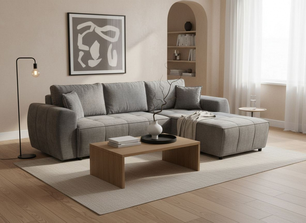 Moderna sedežna garnitura LORI ima trše sedišče, možnost postavitve levo ali desno. Omogoča sproščujoče sedenje in počitek, dodatni predal pod pomožnim ležiščem. Ima pomožno ležišče v velikosti 125/145x210 cm. S čudovito oblikovanimi rokonasloni in elegantnimi nogicami, bo v vaš dnevni prostor vnesla pridih modernega minimalizma.