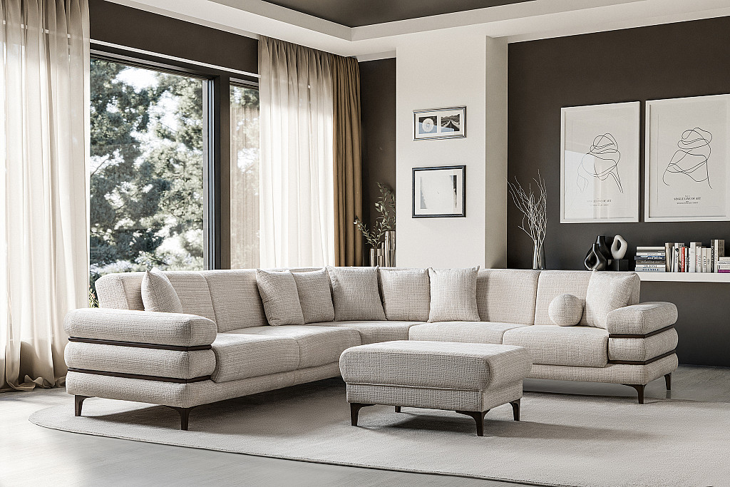 Sedežna garnitura ODESA, bež, oreh / VZMETENO ima vzmeteno sedišče, bonel vzmeti Omogoča sproščujoče sedenje in počitek na udobnem vzmetenem sedešču. Ima dodatno obdelan hrbet. S čudovito oblikovanimi rokonasloni in elegantnimi nogicami, bo v vaš prostor vnesla pridih modernega minimalizma. Sedežna garnitura ima trosed dimenzije širine 211 cm in globine 92 cm in višine 82 cm + dvosed širine 171 cm globine 92 cm in višine 82 cm .in kotni element širine 112 cm , globine 112 cm in 82 cm višine. Sedežna garnitura je sestavljena, potrebno je postavit elemente, rokonaslone ln pritrditi nogice in določit ob montaži smer postavitve. Višina sedišča cca 45 cm, globina cca 62 cm. Teža sedežne garniture je cca 120 kg. Sedežna garnitura je dimenzije: širina 283 cm, globina 323 cm, višina 82 cm. Dekoratvne blazine so vštete v ceno izdelka. Velika izbira barv po naročilu. Možnost naročila LEVE ali DESNE postavitve sedežne garniture. Sedežna garnitura ima pomožno ležišče cca 190x110 cm ter 2 predala za shranjevanje